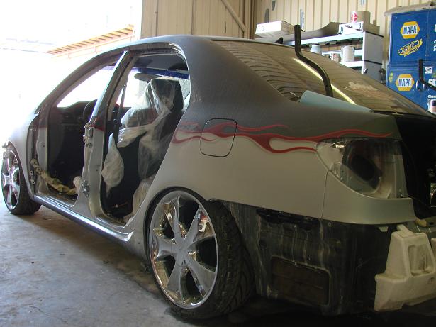 CLEAR TAILIGHTS, UPPER AND LOWER BILLET GRILL, SHAVED EMBLEMS, SHAVED TRUNK, CLEAR HEADLIGHTS WITH FLAMES PAINTED INSIDE, FLAMES IN THE TINT BY PERFECT SYMMETRY, PAINT DONE BY METAL ASYLUMN KUSTOMS (480)213-9618