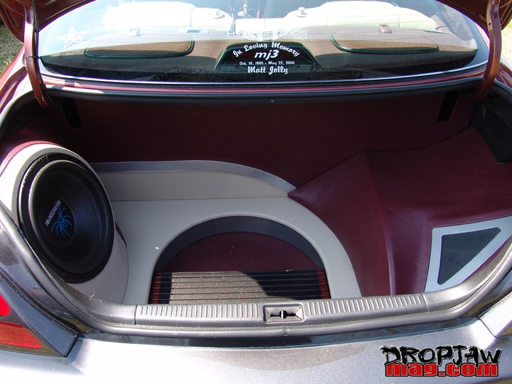 Fiberglassed and wrapped trunk by Sonus Car Audio. Painted amps lots of speakers