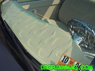 Malibu sand tweed, tons of billet and chrome, one off air gauge mount, embroidered seat, 100 dollar bills and skulls. Fully carpeted with bisquik carpet. Custom fiberglass center console. Hand made door panels that house two sets of audiobahn 6.5 inch 2 way speakers. custom kick panels with 5 and a quarter audiobahn 2 way high's, flamed billet door handles. Raised flames on dash, A-pillers, and door panels. Billet gauge cluster surround, Flamed gauge overlay and all plastic painted to match. Colorado customs billet flamed steering wheel with one off engraved horn button. Custom shortened and bent shifter with hand made skull shift knob.