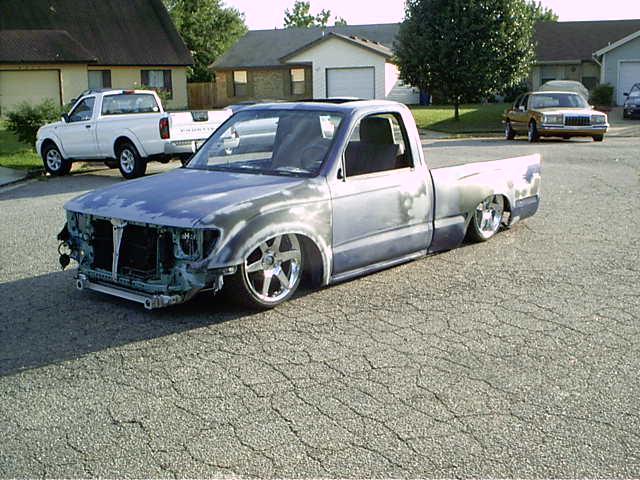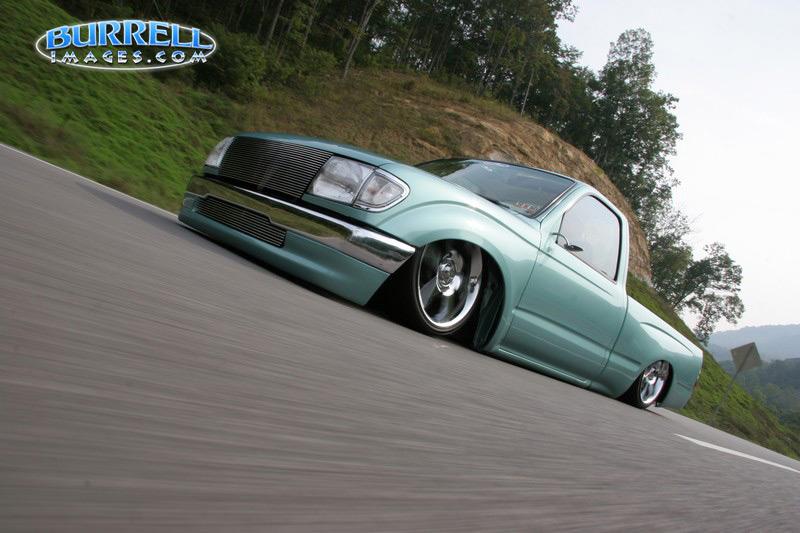 Just repainted AUG 07 custom mix PPG money green. Shaved: handles, gas door, rear cab lines, mirrors, antenna, wiper squirters. Billet mirrors. Molded headlight filler panels to fenders. Molded fenders, Full skin combo. Tan rag top, billet grill, 4 wheel drive chrome bumper, 2 wheel drive valance and billet insert, half cab cut out for stereo, custom one off third brake light, flared bed sides, turn signals moved to side markers, suicide doors with filler panels welded to cab between fender and cab. Full sheet metal bed with radiused rear bed corners and half round metal speaker enclosure.