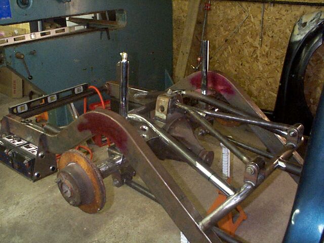 Stock Floor bd 3 1/4", Pro hopper juice, mandrel bent rear rails, with 2x4 tubing under the cab. Rear axle,narrowed 9", with axle shafts resplined by Dutchman Motorsports, narrowed for a deep ass offset. Front upper a arms with uniballs to handle the 19"ers.