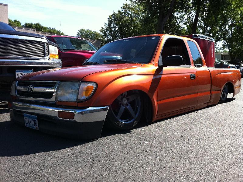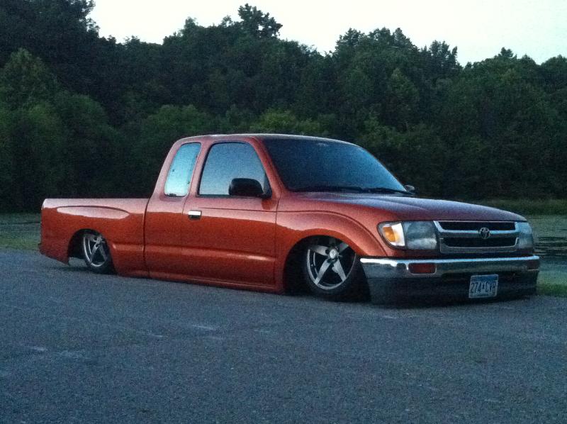 shaved squirters, antenna, gas door, tailgate handle with tailgated molded shut and molded in sectioned rear bumper. stock bed floor with sheetmetal sides, linex'd. Painted GM Atomic Metallic Orange.