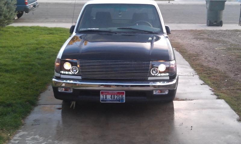 Stock White Paint, Blacked out Halo Projector Headlights, Clear Blinkers, Blacled out Corners, Shaved Tailgate and Custom Licence Plate Box, Molded F.B.I. Rollpan, Phantom Grille, Chrome Bumper