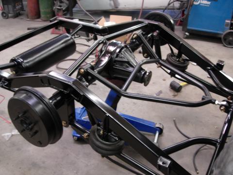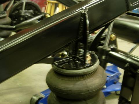Firestone 2600 big bags, custom front bag mount, modified 3/16” plated frame, modified radius arms, DJM upper arms, ½” 350 psi valves, ½” fittings, Reverse bushing modified 4-link, boxed and super notched, custom shock and bag bridge, two firestone 9210 compressors, two Firestone 5 gal. ½” port tanks, custom tuck-up rack, port Doetsch Tech shocks, custom mounts for relocated fuse box and evap canister, Battery & gas tanks relocated to bed, extended wire harness, front wheel wells cut and beaded, cut and tubbed firewall to fit 19’s, Alston tubs, custom hinged bed cover, KP Playstation controller (air)