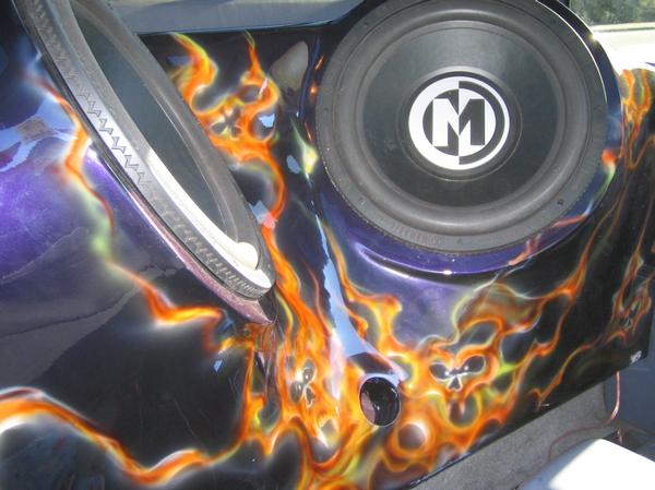 all painted to match with fiberglass box filling the rear with two 15" subs billet wheel