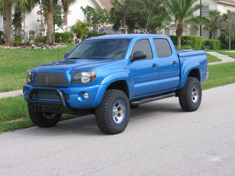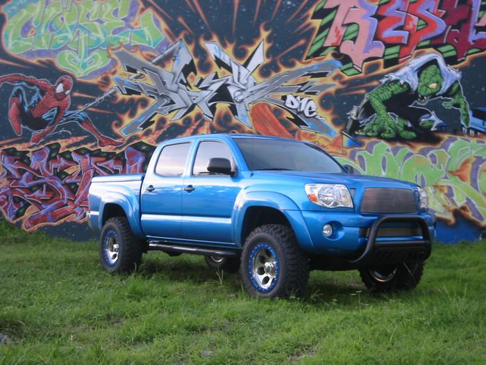 Westin front bull bar and side steps, T-rex billet grilles, replaced the chrome grille with a blue one, ARE LSII tonneau, black headlight mod, TRD scooped hood
