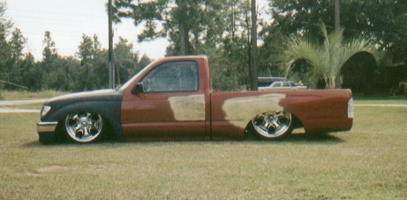 This truck is owned by Tommy Price and is being built by his brother Mike Price DBA Extreme Fabrications. It is the first Taco we know of rollin 20's all the way around (and laying body), The 20's were fitted in the Spring of 2002. Special thanks to David Smith of Bagdad, FL for the metal fabrication of the bed.