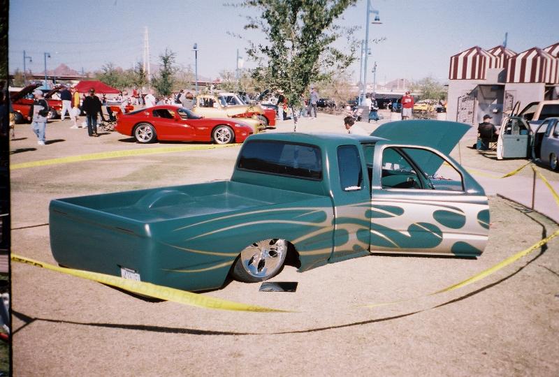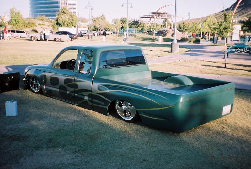 shaved door handles, mirrors, front turn signals, tailgate, tailgate handle, gas door, rocker panels molded together, firewall, third brake light (hump cut out of roof and smoothed back in), smooth bed floor, smooth door jams, tailights (replaced w/ 10" LEDs), lines under rear window, suicide doors, primer and custom graphics (done by john owens & other members of perfect poise), body dropped 4 1/2", smooth bedsides, tubbed(FOR SALE)