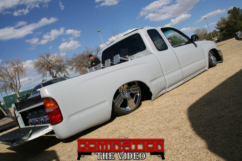 2000 4runner front clip. Shaved: Front corners, handles, mirrors, squirters, third brake light, cab lines, antena, tail gate handle, gas door. 59 caddy tail lights, molded SR5 hood scoop. Fully smoothed and sheel metaled bed floor.