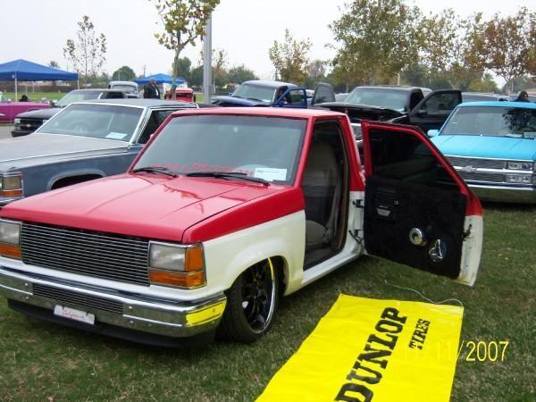 Freaks of Nature member out of the Bakersfield chapter...91 ranger single cab long bed... stockfloored on 20s and a 3/4 frame, hydroholics 1 pump 5 dump setup, toyota front clip, modified ower control arms and drop spindles, sheetmetal floor, firewall and back wall, smoothed door jambs, radiused door corners, shaved drip rails, shaved wipercowl, door handles, keyholes, mirrors, cab seams, civic bucket seats without the headrests. Ford 351 windsor smallblock V8 thats stock for now but will be getting heads, cam, intake, carb, dual shotgun style breather and custom made headers.