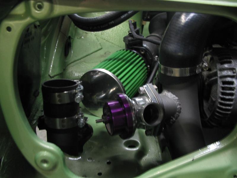 T3/T4 turbo, big ass blowoff, green series intake cones, custom built (by me) intercooler pipes, huge frontmount intercooler, custom made cover for motor taken from new Jetta(cut by me) painted engine compartment. 2003 VW Jetta 1.8T motor. AEM boost guage, fuel pressure reglulator