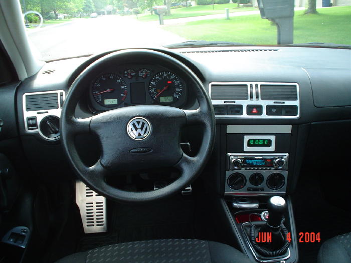 Full brushed aluminum dash kit, Audi TT pedals, Beatle Turbo dead pedal and an oettinger shift knob. Smoked 10 switchbox, dakota digital FBSS air gauge