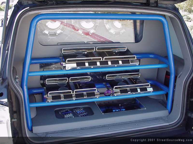To finish off the interior, Trent had a roll cage made by Ruben and Drew of Monkeybars. The full roll cage was powder coated blue for added looks. Finally, to finish off the modifications to the interior, Trent was now ready to work on the audio and video of his Explorer. A Clarion double din MAX2256 CD and cassette player with monitor, along with a Clarion 6-disc changer, was used as the starting point. Trent then went with an Audiobahn 30 band EQ to help balance the sound throughout the Explorer. Three Audiobahn amplifiers were used to push the sound through the series of speakers. One was used for the six 12-inch Audiobahn Aluminum subs, one for the mid-bass in the front doors and the final one is a four channel, used to help the high end. All of the mids and highs are mounted in kick panels amongst the door panels and floor. To help bring out the bass, an Audiobahn bass booster was installed.