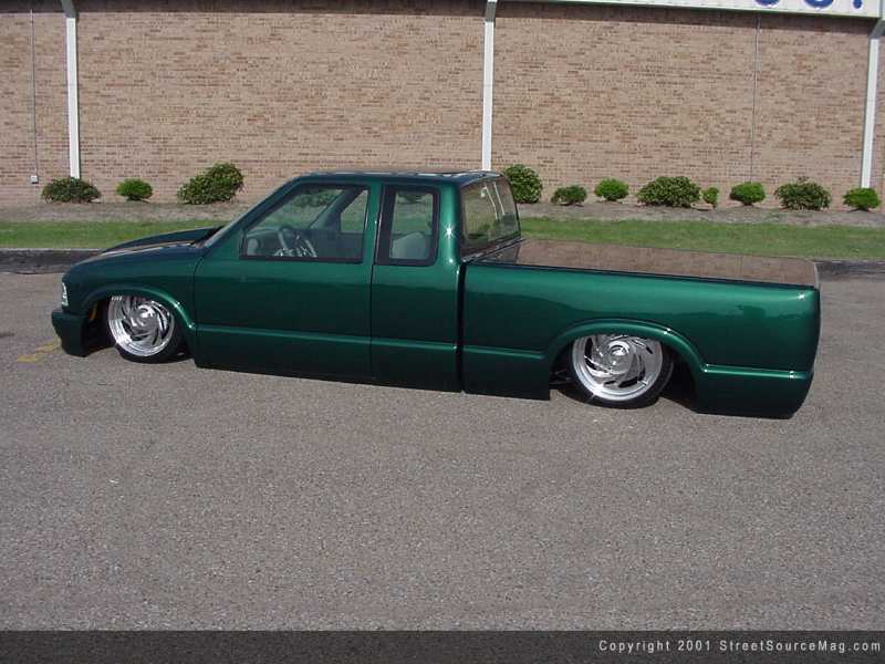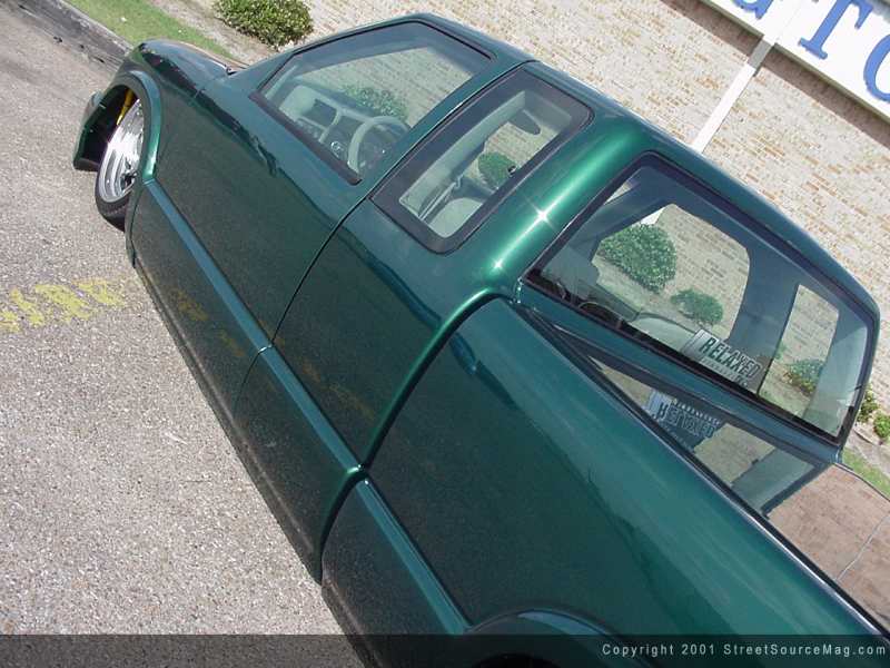 Starting in the rear, the taillights were shaved, as were the tailgate and tailgate handle, giving the rear a new smooth look. Completing the new look in the rear, Jason ditched the factory bumper and welded in a steel roll pan complete with Toyota Supra taillights and welded in a tilted license plate box.  The pair next shaved the gas door and relocated the filler next to the inner fender well.
