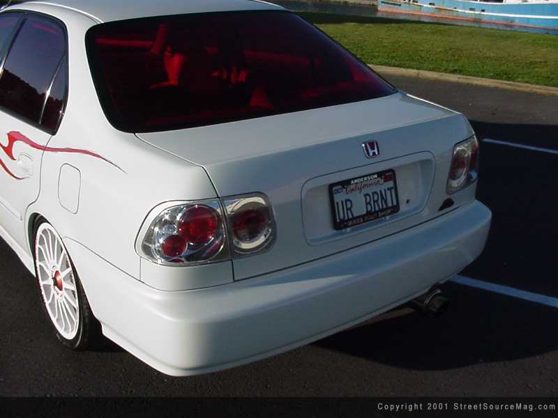Having the 1997 4-door civic now on hand, it was time to start working the exterior items to there liking. Beginning with the front clip, the stock Honda bumper was ditched and replaced with an EVO 1 giving the car a much meaner European look moving down the road. With replacing the headlights with Hyper-white bulbs, the tail lights where also replaced by a set of Euro clears along with a new set of emblems to bring out a much cleaner look.