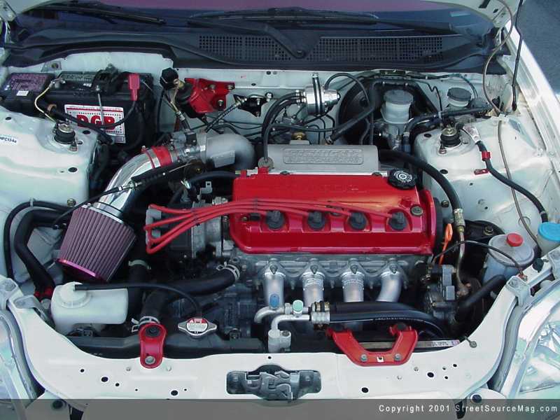 Now having the car just about complete, the two decided that being an import and all they would need to put a little work into the engine bay. For starters the plug wires where ditched for a set from MSD. To help the engine spool up for better performance, an AEM Cam Gear along with AEM pulleys where installed. Helping the engine breathe with the new additions, a DC sport ceramic header with 3" custom exhaust would be installed topped with a polished Can muffler.