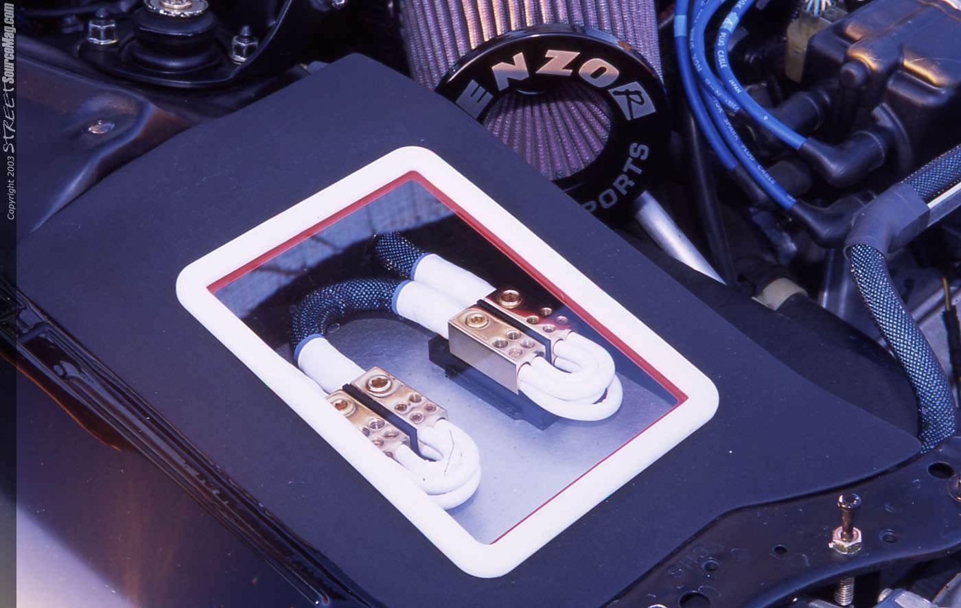 With Randy having previously worked on an Acura Legend which he competed and won numerous IASCA titles in the 90's, it was the decision after a long conversation with Chad at the 1999 consumer electronics show that it was time to build yet another dominating ride. The first car he would send Chad was not in the best of shape so the decision was to sale it, which they did and purchased a new one that, was in much better shape. With Chad being an installer at Soundworks it would be easy to rework any of the wiring stereo and video needs they would deem necessary for this project. With all intentions of this ride being built for stereo, the ensure us that much more engine and exterior modifications will come later on this year. Starting with the engine, all factory wiring in the engine bay was rerouted to where it was pretty much invisible.