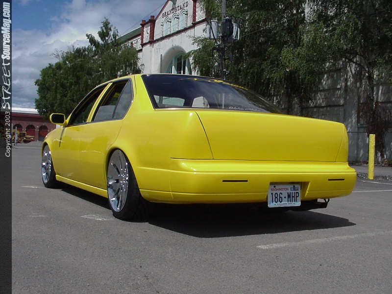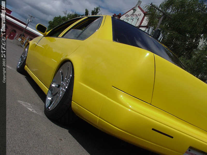With the exterior complete it was time to bring things down to a much-improved level. The stock suspension would all be trashed and replaced by a set of refabbed Chassis Tech strut bags with fast valves to bring things up and down quickly. A front strut tower bar would also help keep things tight in the corners. Next the sub frame would be cleaned up and painted black. One more item at hand for the exterior would be the replacement for the exterior. A set of 18x8.5 Giovanna Barletta's, which have been wrapped in Yokohama Parada 225/40's would be Tom's choice of shoes. This would leave the interior to have reworked to Tom's standards. This would all be left to Jason Knauft of Bitchin' Stitchin', Spokane, WA. Jason would first start with the dash, which would be wrapped in graphite tweed along with yellow inserts. The doors would be done the same along with a coble stone look followed with a set of flames. Keeping things flowing, the headliner would receive the same attention. Other interior panels would be smoothed out and painted, including the rear deck.