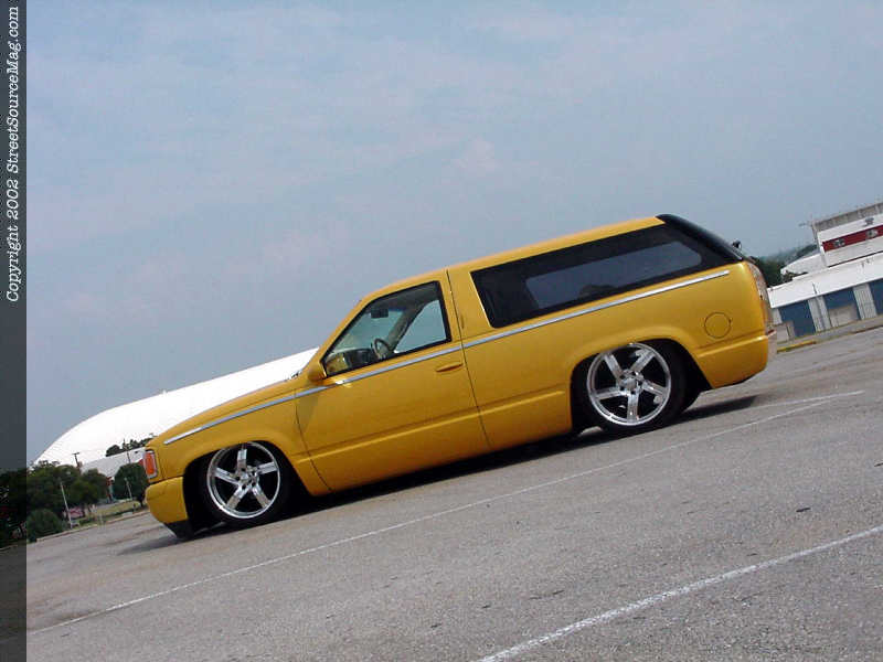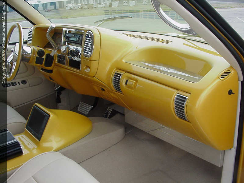 With the newfound low, the rear floor section was cut and raised 7 inches so the gas tank could be raise and the Tahoe could sit a little lower. With a nice added touch, they would install three train horns to make sure everyone knew you were coming.  It was now time to work miracles with the interior. Starting with the Dash, it would be smoothed out and painted to match the exterior along with having the headliner wrapped in tweed along with the floor of the Tahoe.