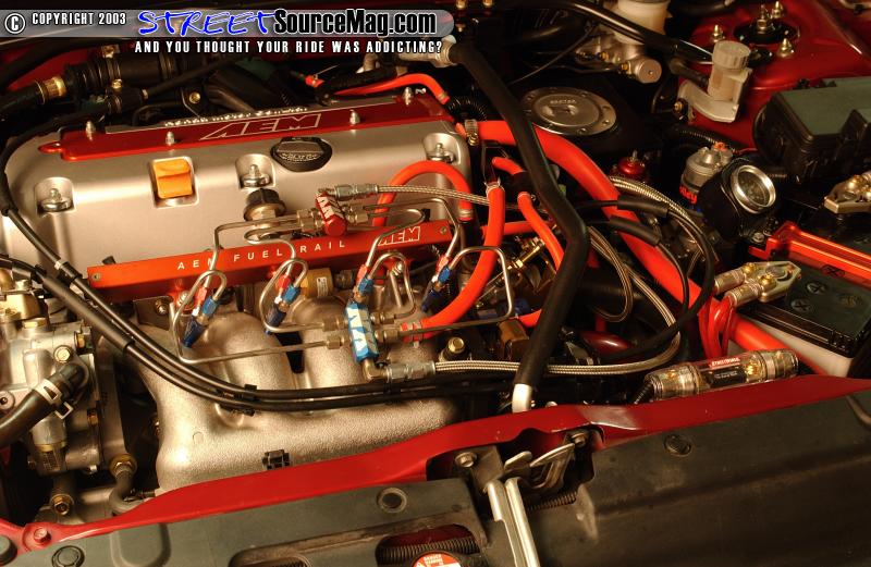Helping to keep the power to the ground would be an Advanced Clutch Technologies organic street disc with an ACT Xtreme pressure plate and Mugen limited slip differential; all provided by King Motorsports. Denso Iridium spark plugs and MSD Ignition components help give the engine spark while Thermal Flex silicone hoses help provide proper vacuum. With all the modifications made this RSX is pushing 265 HP at the wheels and an 80-shot NOS, not to bad.
