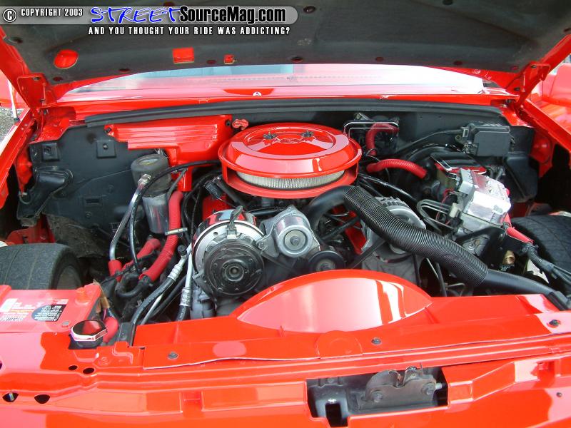 Jon decided to treat the stock 350 engine and engine bay much like he did the chassis; every nut, bolt and screw was replaced with a new fresh powder coated replacement. Any item that could be removed was and then treated to either powder coating or paint.  Jon completed the second phase much like he did the first, on a deadline. Jon was finished the final touches only a mere 2 hours before it was time to leave for Greenville's Showfest 2003. Much of the truck had only been out of the paint booth since the morning before. Talk about cutting things close, but like always Jon came through.