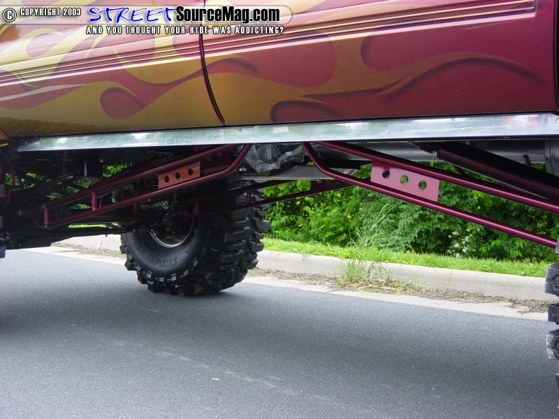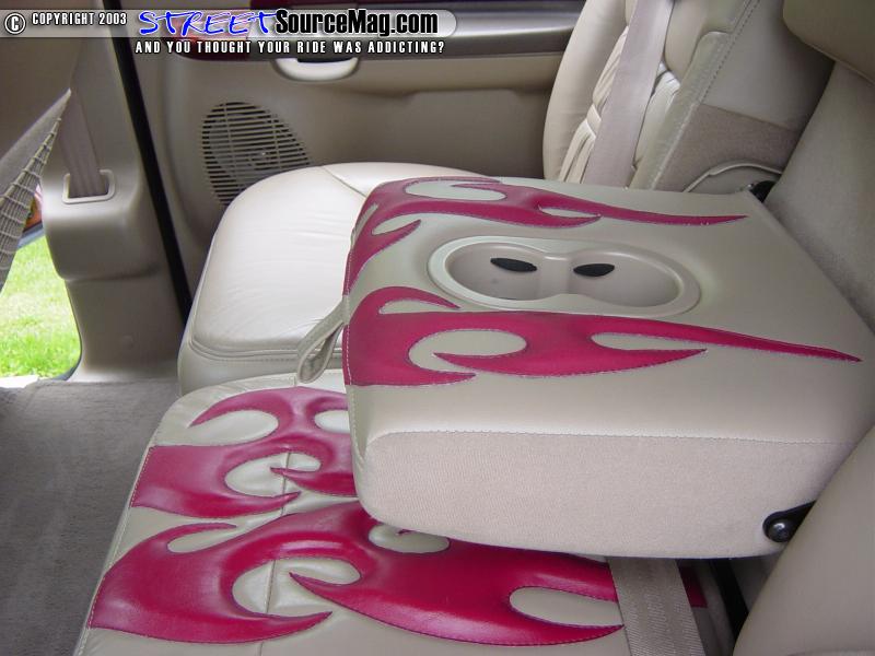 Now that the body was done, it was time to get the interior up to par. While the body was being painted, Paul took a few plastic pieces out of the interior and painted them to match. He also added a few billet pieces throughout the interior.   Being the truck came stock with leather seats, Paul decided to have T&C Upholstery out of Manassas, Virginia stitch some red tribal flames through out the center of all the seats.