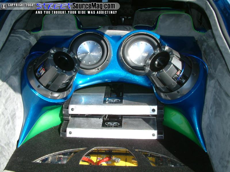 Next on the agenda for Kris would be a kick ass stereo set up. Keeping the same Pioneer in dash DVD/TV head unit in tact, Kris would build a new system around it. For starters 3 sets of Rockford Fosgate T162 components would be installed along with 4 Rockford Fosgate T1 10s. One Rockford Fosgate T2000.1bd is found pushing the subs while a Rockford Fosgate t800.4bd runs the mids and tweets. The use of a Rockford Fosgate 40 farad carbon capacitor,  2 optima yellow tops and all Fosgate wiring help keep the current flowing while 104sq feet of Rockford Fosgate dead skin through out the car help keep the sound in. The custom enclosure housing the subs would be a fiberglass enclosure also housing 3 18 inch blue LED tubs behind the amps and under the floor. Kris and Restricted Rick completed the entire Stereo install the night before SEMA.