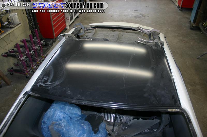 Grab an acid brush and the panel bond and apply it to the roof skin. I would suggest wearing gloves because the stuff can be really messy. Make sure that it covers the area you scuffed. Next grab a partner (this will take 2 or more people) and hold each side of the roof. Be careful not to touch the glue, or get your fingers caught in between the roof and the pillar.