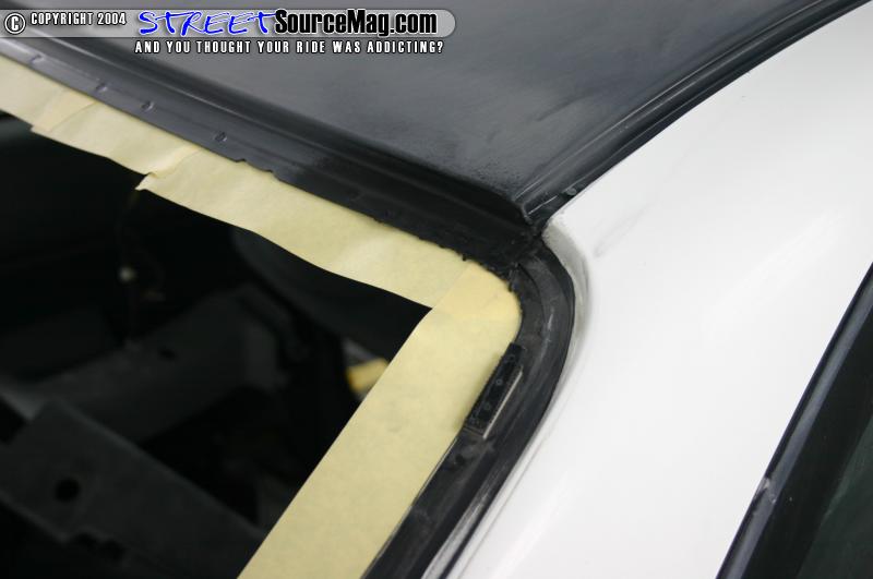 Next the car was pulled in the booth and taped up. After the car was prepped for sealer and paint I applied the seam sealer to the roof so that no water could leak in. After putting on my mask and mixing the paint I was ready to step into the booth. I first sprayed a few coats of Standox Sealer to the roof and let it dry. I then based out the roof with Dupont Taffeta white, and then cleared it with Dupont clear. The car was then baked. I wet sanded the roof with 2000 wet and buffed it so that it had a nice glass appearance. I then hand glazed my whole roof. The roof that I chose to use had factory sunroof in it. I reinstalled the sunroof, and attached the drain tunnels. I then called our friend Mike from Glasscar windows to reinstall the windows. After the windows were back in the car I put the interior back in and the car was now finished.