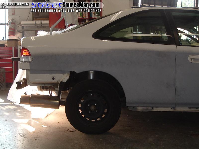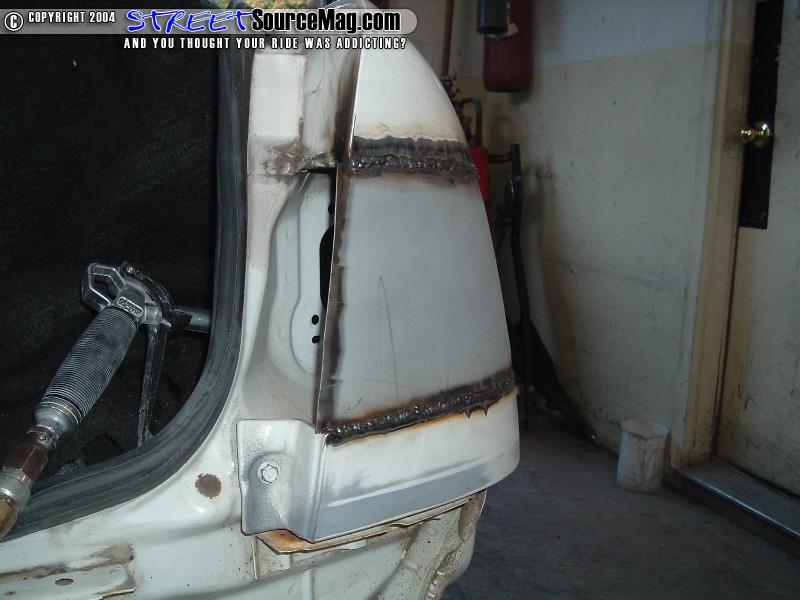 I then sanded all the metal fillers down with some 320 and Weld Sealed all of them until I was ready to weld them in so that they didn’t get surface rust on them while they sat. Next I popped my trunk and removed both of the tail lights which were held in by 4 10mm bolts on each side. The lights were then removed and I fitted my fillers. The fillers fit pretty good they only needed some adjustments. We started out by welding in the lower filler plate. Once that was welded in we moved on to the actual tail light filler and molded that to the quarter.
