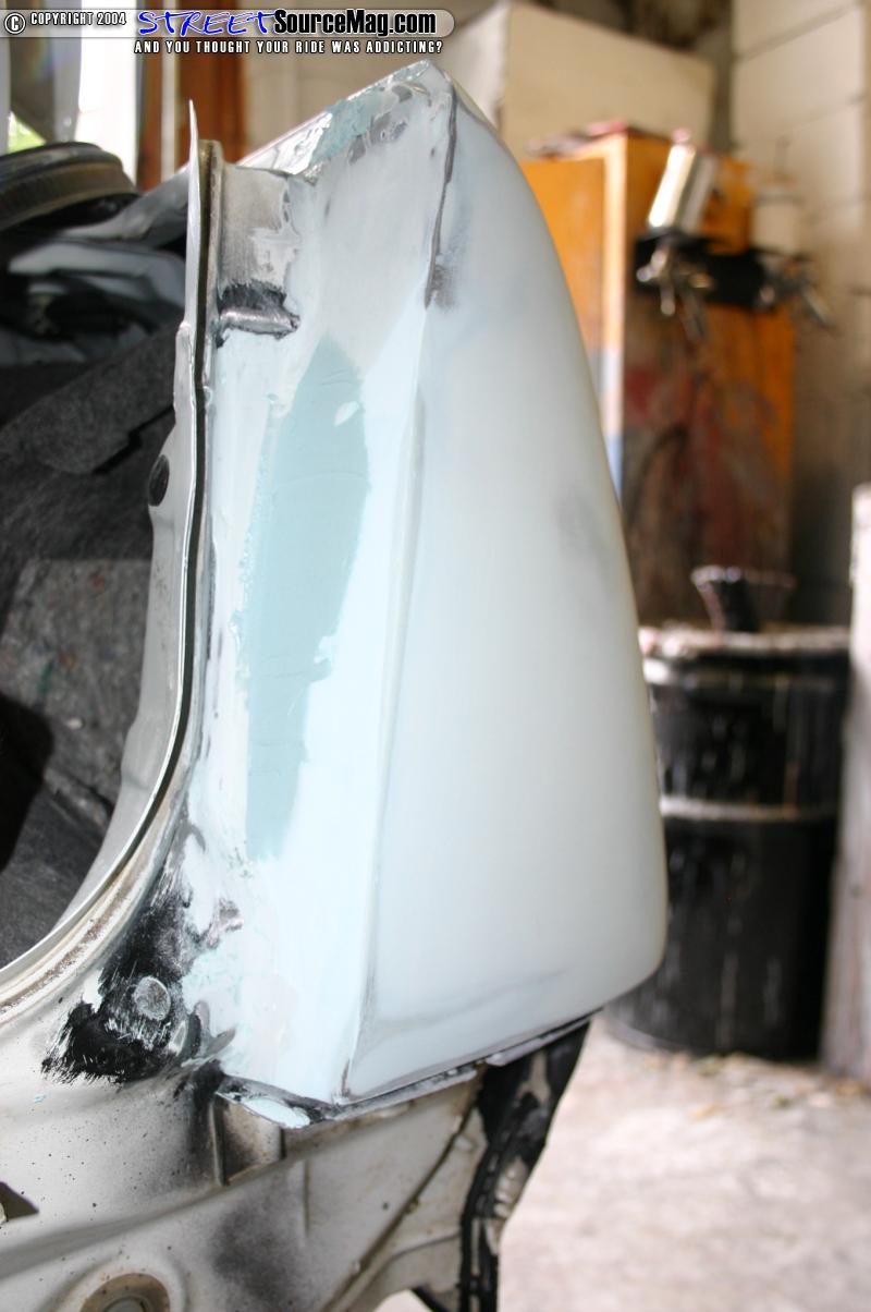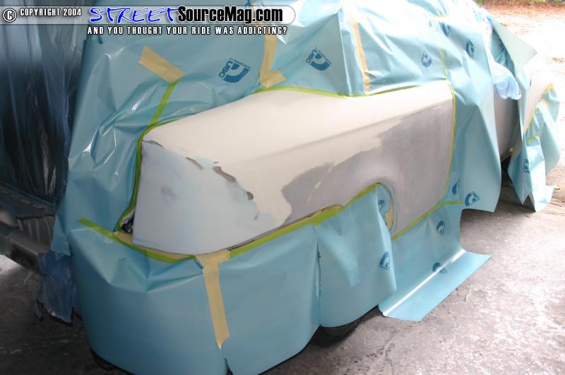 I taped up the quarters and scuffed the areas that were not already 320 sanded. I began by spraying some etch coat on the quarter over any bare metal spots. I then applied 3 coats of high build primer to each quarter. The quarters/tails were then sprayed with guide coat so I would know of any high or low spots when sanding it. When the prime was dry I blocked it out with 180 on a long board. I guide coated the whole quarter and tail section again and blocked it out with 320 on a long board. The car was then left in the sun for about 3 days because I couldn’t bake it at the time.