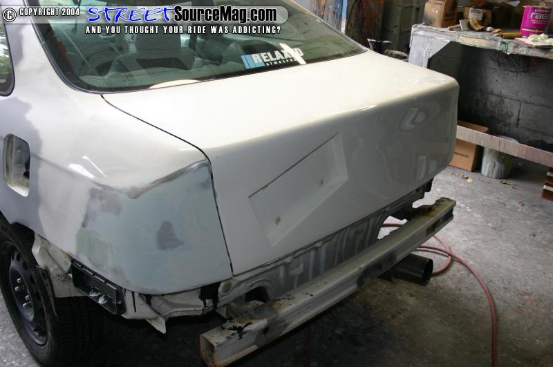 The bodywork soaked up the first time and I pulled it back in and blocked it again with 320. After I blocked it I tapped it up again and primed it with another 3 good coats of high build. I then sat the car in the sun again for about 3 days before I touched it again. This time the car didn’t soak up at all so I pulled the car in and blocked it out with 180 real quick, then 320 on a long board until it was nice and smooth. I then wet sanded the quarters, tail section, and inner jamb with 600 wet and the car was ready for paint.