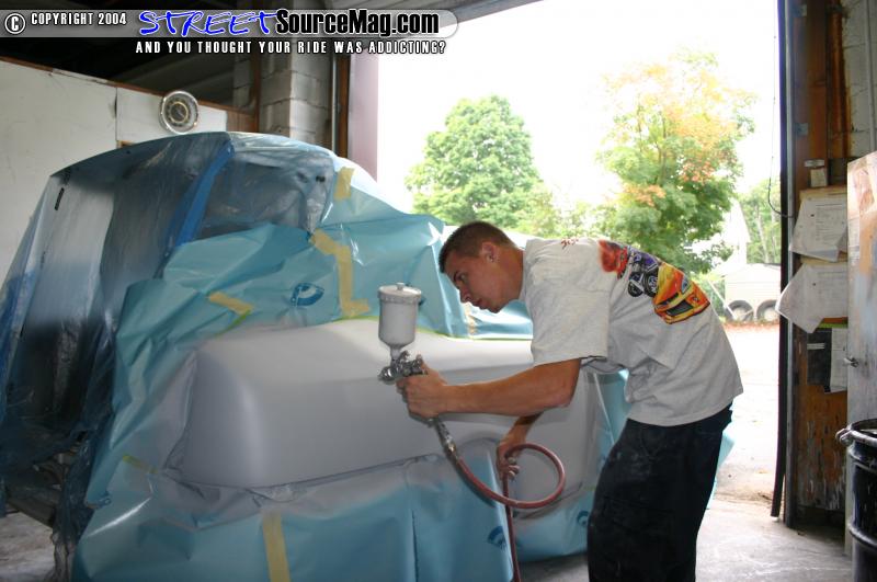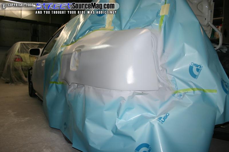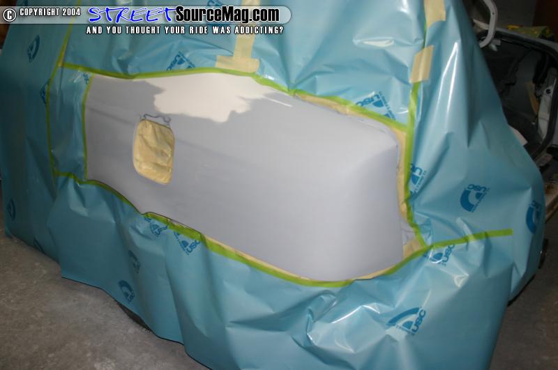 In the booth I sealed both quarters and tail sections. I then applied 3 good coats of base to each quarter section. Last I applied 2 good coats of clear to the quarters and then baked the car. I used all Dupont materials in the booth. When the car was done I pulled it out of the booth and left it over night. The next morning I wet sanded the whole quarter and tail section with 2000 wet and then buffed the whole quarter.