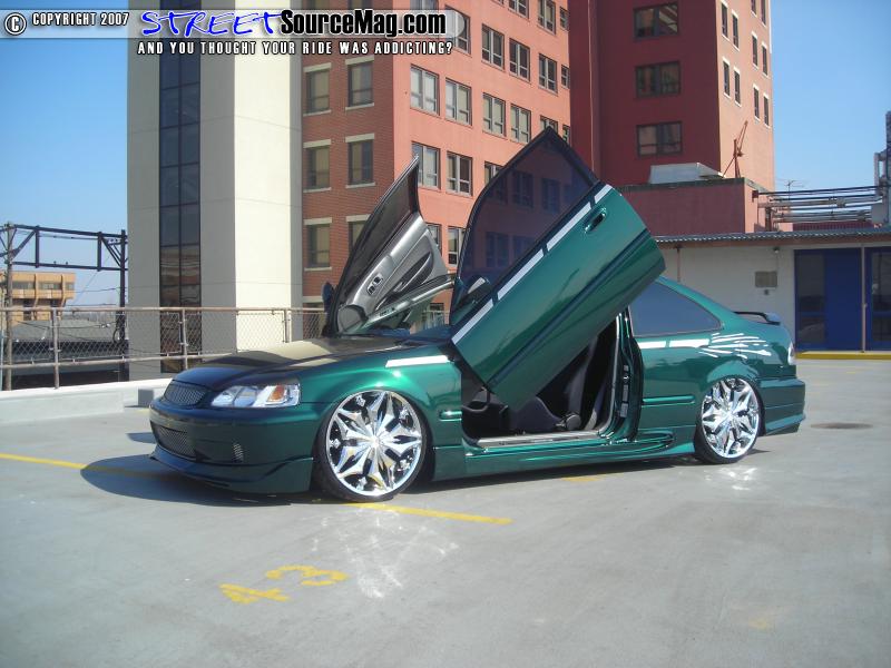 What would a custom car be without the doors swinging in a way other then stock? With that in mind a lambo door kit was added to get this car some serious attention. Once all the work was finished and prepped, Rick Freeman of Laffon Auto Body was commissioned to spray the Dupont Clover Green Pearl paintjob. Stripes L.T.D. then applied the black and silver graphics. Some carbon fiber eyelids for the headlights and APC carbon fiber taillights finished off the outside.