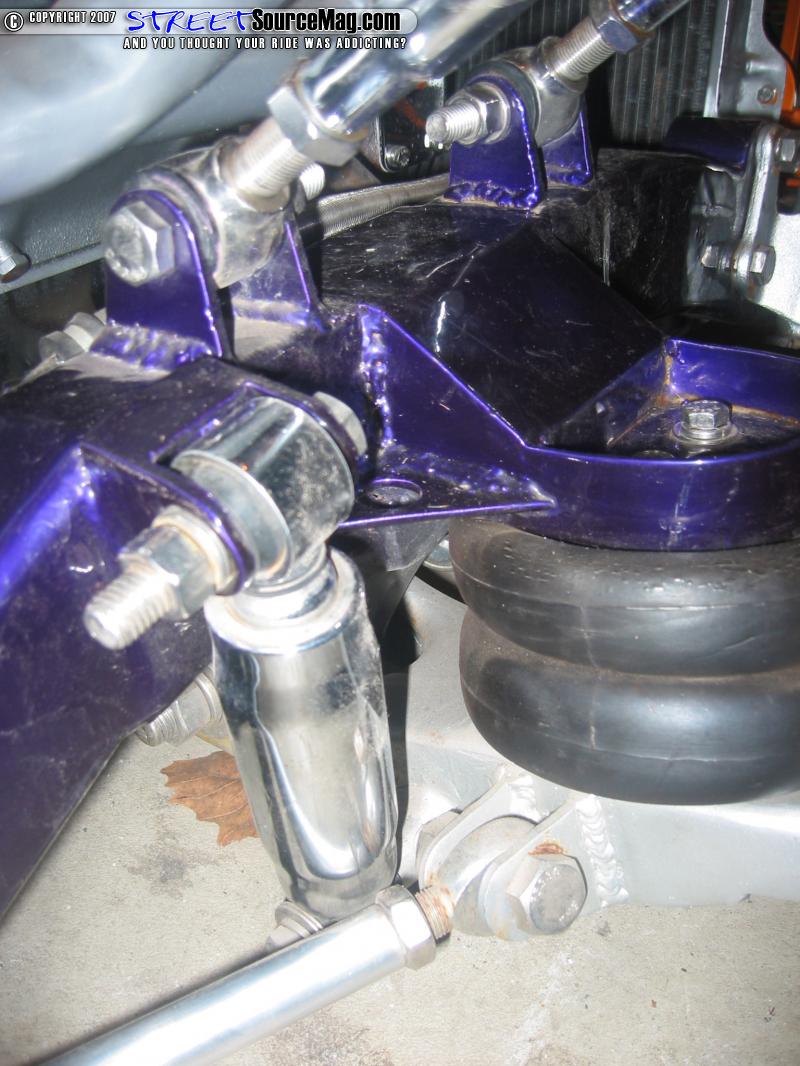 Starting with the chassis Ryan would utilize 2x3-boxed tubing for a custom frame for a stock floor body dropped appearance. The frame would then be powder-coated candy purple. Next a 300z rear end would be set into place. Next Ryan would install a set of tubular upper control arms, Slam Bags at all 4 corners, all stainless hardware, 9-gallon chrome tank and 2 Viar 450s. Having everything set into place Ryan would then have all of the suspension either painted VW silver metallic or chrome plated. With the body now flat on the ground the fenders would welcome in the new 18-inch KMC Guidos wrapped in Nitto 215/35zr18.