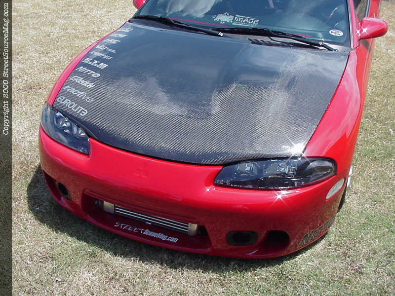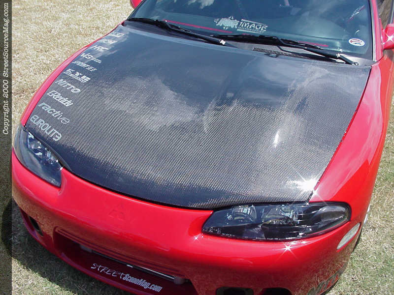The body of Coby’s Eclipse was next on the agenda. First, Coby bolted on a VIS Racing carbon fiber hood. Next, an Erabuni GTR wing was put in place and APC clear bumper lights and APC clear taillights were installed. Next, Syndicate Graphix was called upon to create a set of black and silver tribal graphics to go over the stock radiant fire red paint.