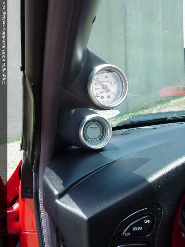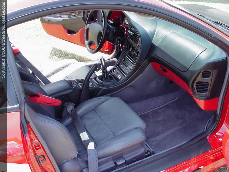 Interior upgrades were last on Coby’s list of To-Do’s. The gray leather seats were highlighted with red trim. Carbon fiber inserts were installed in the dash along with a SpeedGlo gauge insert from APC.  Extreme Motorsports provided the gauges pod that house Autometer boost and air/fuel mixture gauges. Inside, you can find other upgrades such as an HKS turbo timer, pulsing neon and interior strobes from Toucan Industries, as well as hyper white driving lights from Toucan. Toucan also provided pedal covers and a shift knob. Syndicate Graphixs handles the interior work.