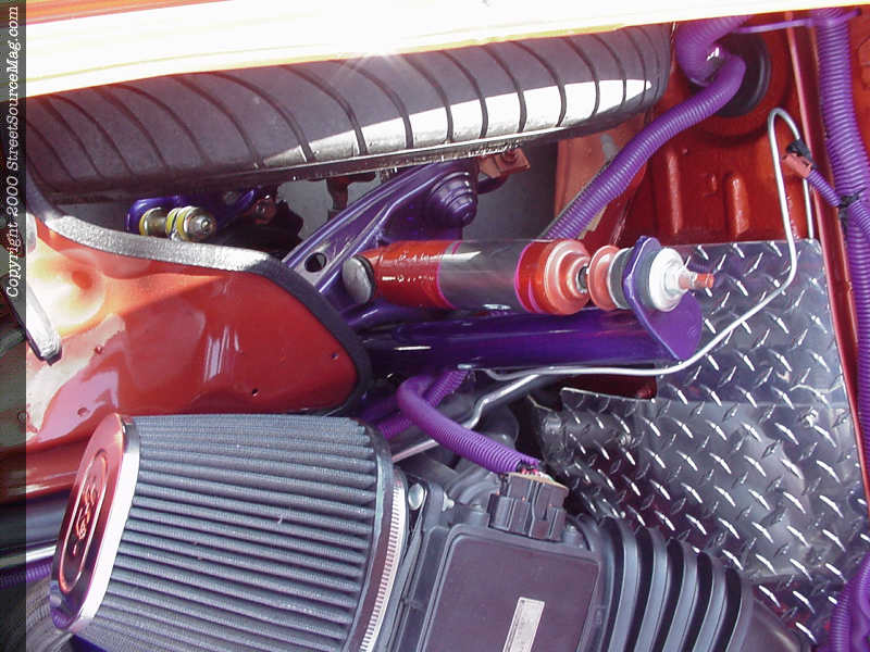 To get to that lowest of low stance, Shane turned to Greg Taylor and TNT Automotive Specialty in Waynesboro, Virginia for help. In their hands, Shane’s Mitsu was first treated to a step notch and bridge in the rear. The leaf springs were tossed and a chrome custom made 4-link was put in its place. 2600lb Firestone airbags were then installed along with Toxic Shocks to smooth out the ride. Up front, Greg installed 2” Superior drop spindles and 2500lb Firestone air shocks. Custom front shock mounts were created and Ground Control shocks bolted up. Fast actuating valves were installed and give Shane full control while behind the wheel of his Mitsu. To make the judges, as well as others, turn heads, Shane chromed the sway bar and strut arms, installed a ’89 RX-7 fuel tank and painted the entire undercarriage Ford Probe Purple. Laying frame was nice, but it wasn’t quite enough so TNT Automotive performed a 2-½ inch body drop. Laying body, Shane kept going with his Mitsu by moving on to the body.