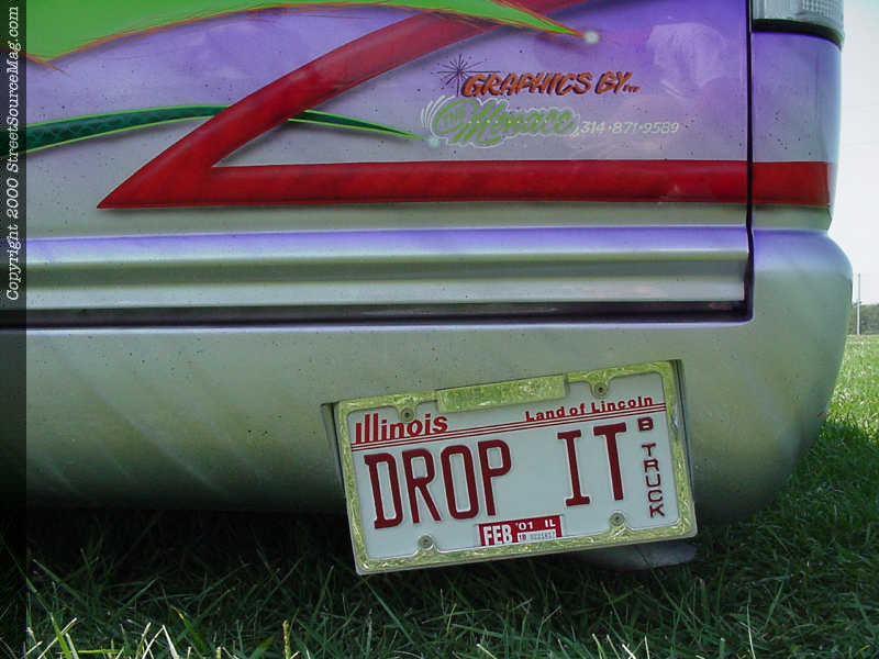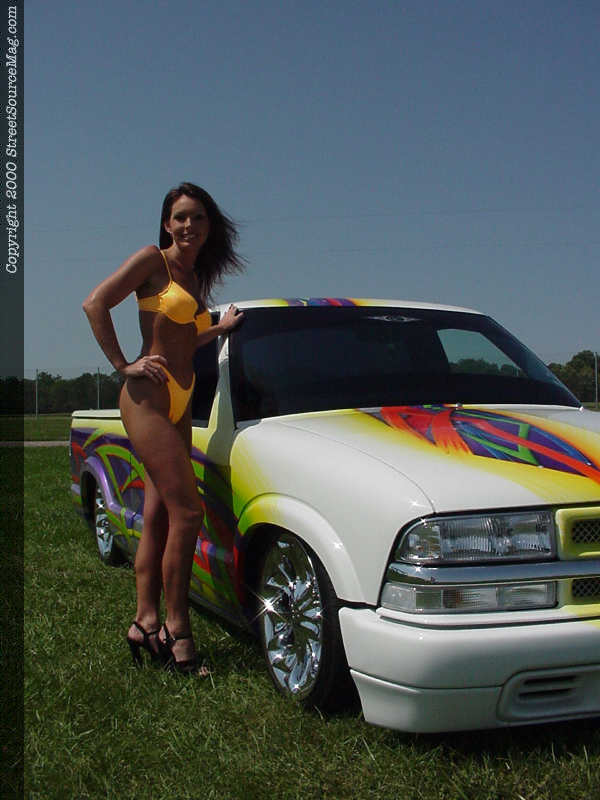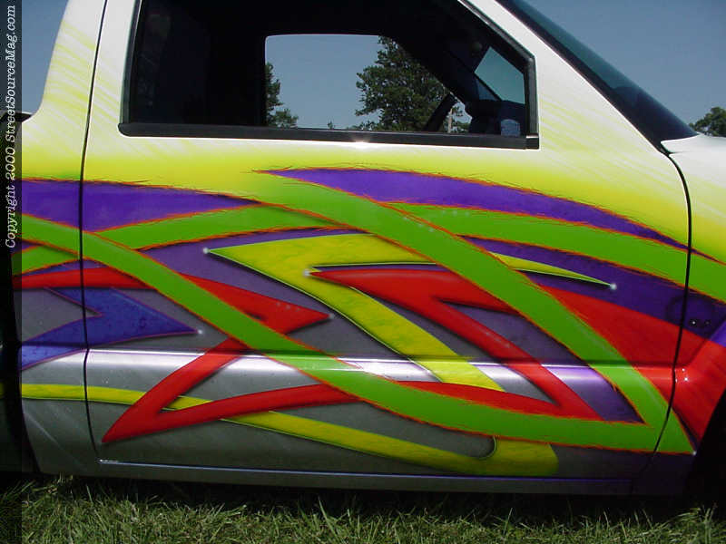 Next, Rob’s S-10 was taken to Dennis Virgil of St. Louis, Missouri to get the wild graphics laid down. Utilizing 41 different colors, Dennis went to work painting in a total of 120 hidden skulls, in the mix of all the tribal graphics and flames. Also within the graphics you’ll find Cheetah print, snakeskin and water tide swirls. Dollar signs also can be found within the graphics. What really sets off Rob’s S-10 is the fact that this truck is double sided. The graphics are different on each side, which allows you to look at it closely for hours to see all the visible and hidden graphics. The graphics also were painted between the cab and bed for a true custom job.