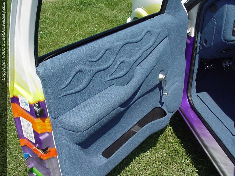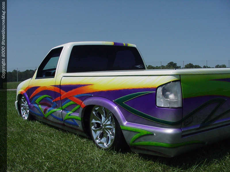After the wild graphics were laid out, Easy Ed came in to add painted pin striping throughout the graphics. Other exterior features on Rob’s S-10 include blue headlight bulbs and clear corners. The taillights are also clear. With the graphics finally complete, Rob moved to his interior to give it a full show look. Jeff Hamilton removed the headrests and reshaped Rob’s ’97 Grand Am GT seats then covered them in Academy Blue tweed. Rob then covered the headliner and stock dash in the same color tweed and added many billet inserts for accent. Rob and Art Gordon have covered many other things in tweed. Next, Rob installed a custom stereo for sound while he’s cruising. Rob started everything off with a Pioneer graphical stereo and using MTX amp, gets the sounds throughout the cab using JL Audio speakers. Finishing off things, a Grant carbon fiber steering wheel was bolted up.