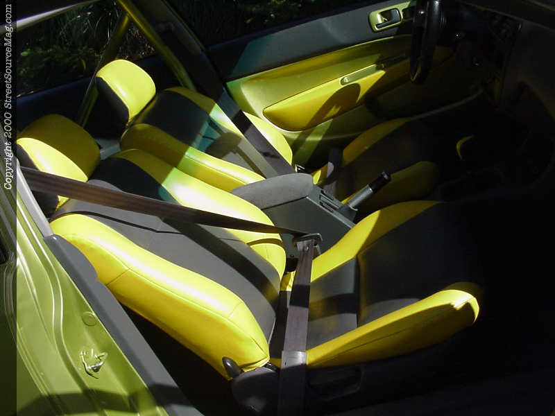 To bring this phat Civic to the eye grabbing attention it deserves, Angi turned to Justin Jones of Redding California to spray down the Sherman Williams electric metallic green paint. Angi’s husband Gabe lended a helping hand with the paintwork as well. While the car was with Justin, they decided to airbrush some ghost skulls into the scallops on the hood along with the door panels. To finish off the outer look Angi went with clear taillights and headlights.   | Even equipped with a Carbon Fiber emblem! | Now since the car was grabbing attention driving down the road, it was time to impress those taking a peak inside. Carbon Fiber inlay’s with custom paint are found within’ the interior along with a Momo steering wheel. The front and rear seats where covered in yellow and gray vinyl seats, which were done by Robs Upholstery in red bluff California.