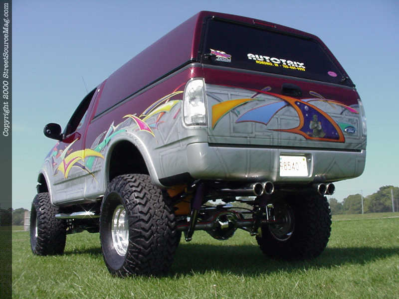 With his truck sitting higher than any other of the same model in his area, Jason knew he was going to need to make some major changes to the undercarriage in the looks department. So, with that in mind, Auto Trix went back to work First, they installed a new Snugtop the rear of Jason’s Ford. Next, suicide doors were on the agenda and the undercarriage was disassembled and everything treated to paint or chrome for added show points.  Finishing things off, Auto Trix installed a TV/VCR combo in the cab of Jason’s Ford and an Aquarium back window (sorry, no fish!).