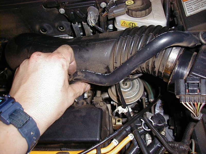 Step 3: Remove the hose that goes from the airbox to the valve cover. Its tricky to do, but play with it a bit and it will come off. Step 4: Pull out the stock airbox assembly. It is held in place by rubber mounts so it just pulls out with a touch of force.