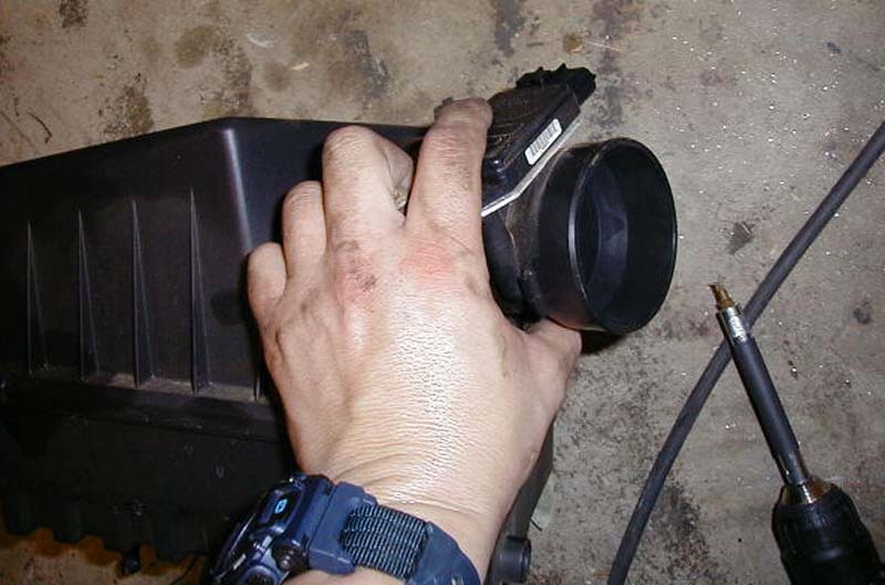 Step 5: Using a torx head screwdriver, remove the mass airflow sensor from the airbox. Huck that airbox in the trash or save it for a nice decoration on your Christmas tree next year. Step 6: Reinstall the mass airflow sensor onto the stock intake tube. Reconnect the hose clamp and the wiring harness.