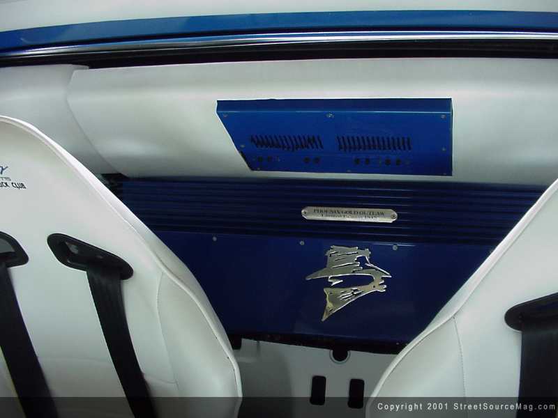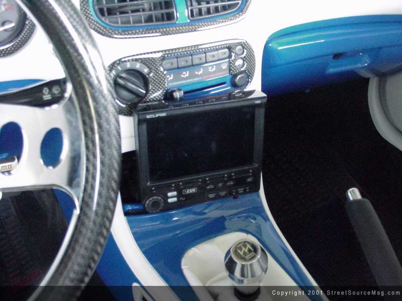 The interior not yet complete, a sound system would be the only thing leaving Donald from going crazy on trips to and from shows. To cure his crazed thoughts, Donald would take it upon himself to install the sounds required. An Eclipse in dash flip out screen, Eclipse in dash 6-disc CD changer would be installed for audio/video needs.  MB Quart mids and highs would be mounted in the stock locations accompanied by a set of JL Audio 8W3's behind the seats in a custom enclosure. Keeping the sound levels at a respectable one, a Phoenix Gold crossover would be mounted in place. Completing the system and helping push the new speakers through out the system would be a Phoenix Gold limited edition outlaw amplifier. Donald would like to thank all of his Sponsors, G&J Auto Body, Quicky's Speedshop and Faulken Tire for their assistance. He would also like to give a special thanks to Jessica Wells, Mark Ramirez, Fast Eddies Upholstery and club members of Gravity Concepts.