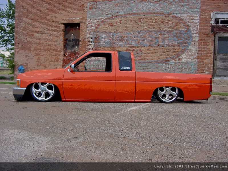On a nice cool day in Jan of 92 David dropped a cool 10k to make this 91 Nissan his own, after 3 years of daily driving and a nicely figured build up price David was finally finished building this hard body to debut at the 95' Heat wave. Being in this sport for 13 years you can learn a thing or two on how to cut corners and make building a truck a whole hell of a lot easier. Some of David's previous rides consist of an 89 Mazda, 77-ford currier and a 92 Chevy suburban on dubz. But David's main reason for building this sweet ride was due to a little peer pressure and the thought of seeing it on the pages of this well-established magazine. (Ok, maybe not just this magazine but to see it in as many as possible) In the process of building this truck David let fellow club member and friend Rob Rodell at Under Ground Customz perform all the suspension work. Up front of this mean bastard Rob installed 2" drop spindles and firestone airbags, with the shocks and tie-bar relocated Rob and David went the extra step of redrilling the front hubs to convert the 6-lug bolt pattern to a 5. With the front end layed down it was time to head to the rear.