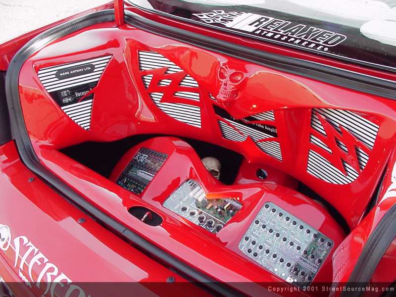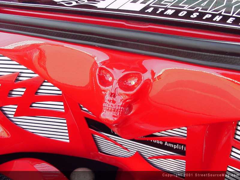 With most of the interior chores complete, Robbie visited an old friend again, Stereotypes, for a complete stereo package that would kill the competition. Starting at the dash, the crew at Stereotypes installed an Eclipse 55430 CD head unit.  Five Mark Antony amps provide power to a custom built box, complete with strobes, neon, and an Alien skull molded in, with LED eyes. Two EQT's from Audio Control keep the sounds going to their perspective places throughout Robbie's ride.