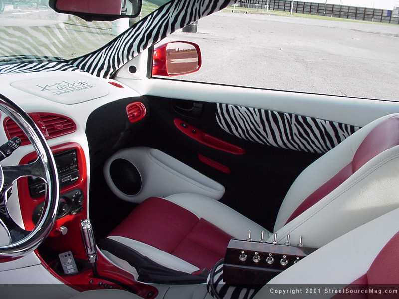 The center console was also dyed red and white and outfitted with black tweed and Zebra skin print.   Billet Accessories Direct provided a one-off billet steering wheel and custom-made white face gauges adorn the dash of Robbie's Alero. Also adding appeal to the dash, the vents were removed and painted Fire red to match.