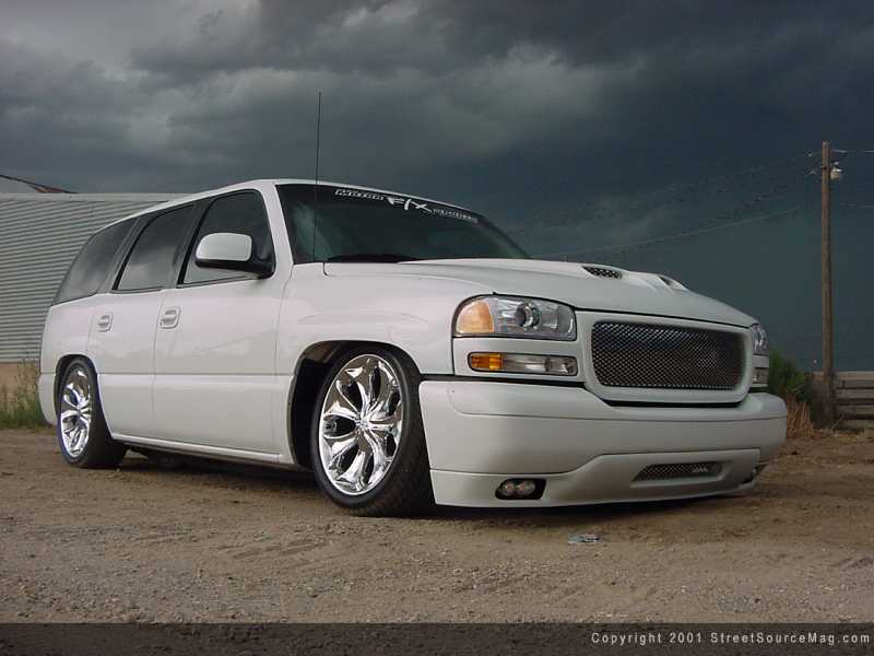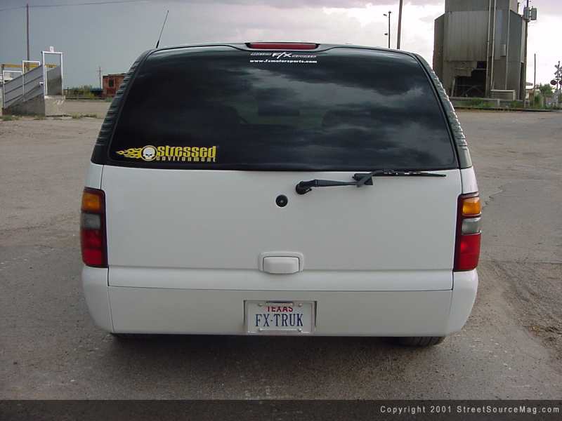 With the grill now taken care of, something still didn't look right for this Yukon so Craig decided to have the front bumper painted to match and shaved the tow hook holes. The headlights from a Denali where installed to help bring the front of this beast to the way you see it today. Out back Craig and the guys at F/X junked the bumper for a steal roll pan and a custom built hidden hitch to pull the toys around with. As for exterior paint Craig kept it pretty much stock except for painting the door pillars black bringing out the all glass appearance.