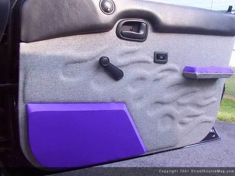 Terence built all new custom door panels and added flamed graphics under the tweed in the front doors and JL Audio logos in the rear doors. The factory carpet was swapped for a new lighter shade of gray carpeting to blend with all the light gray tweed throughout the car as well as the custom made floor mats.